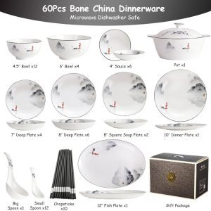 - Products include: 4.5 inch bowl-12 pieces, 6 inch bowl-4 pieces, square pot-1 piece, 4 inch round plate-6 pieces, 7 inch rice plate-4 pieces, 8 inch rice plate-6 pieces , 8 inch square soup plate-2 pieces, 10 inch plate-1 piece, 12 inch fish plate 1 piece, large spoon-1 piece, small spoon-12 pieces, chopsticks-10 pairs, Box